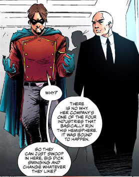 So, that really left me wondering about Sovereign. Does he have powers or is he like Batman/Iron Man, relying more on technology and inventions? I’m a little unsure of what to think there since he’s obviously some type of hero who seems to have some type of clout. He also wears a goofy outfit and say things like, “So, they can just swoop in here, big dick swinging….” You’re wearing a goofy outfit, dude. You’re not allowed to talk like that looking while looking like Bucky Barnes, okay. Actually, he reminds me of Homelander from The Boys:
